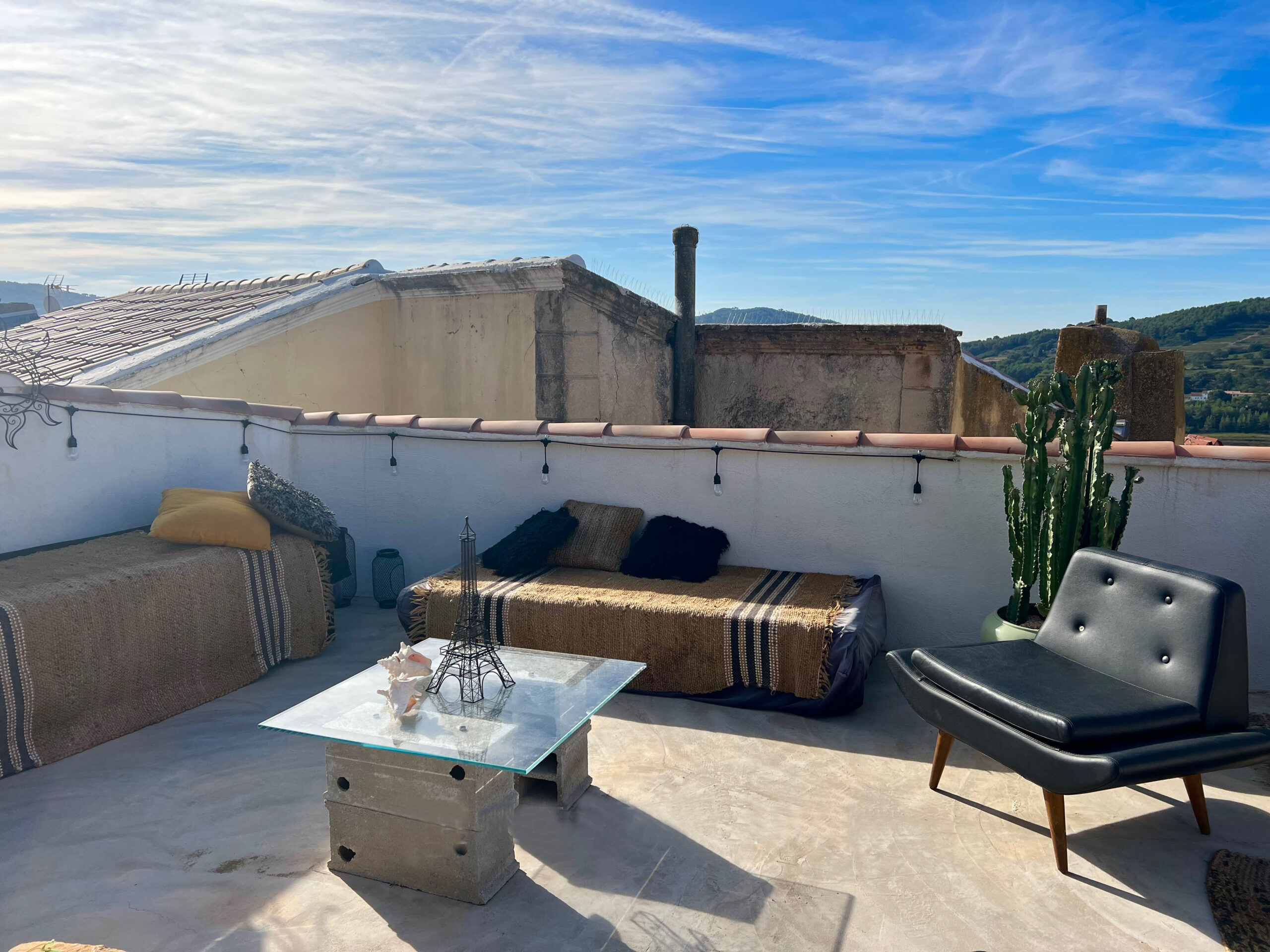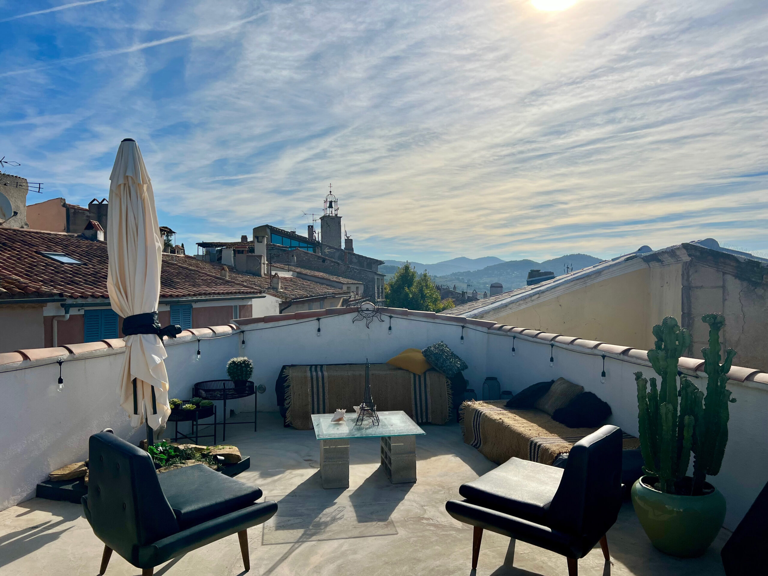 Et au sommet, la création d’une tropézienne de 30 m² a révélé la magie du lieu : une vue imprenable sur les deux clochers du village, les collines et jusqu’à la mer.