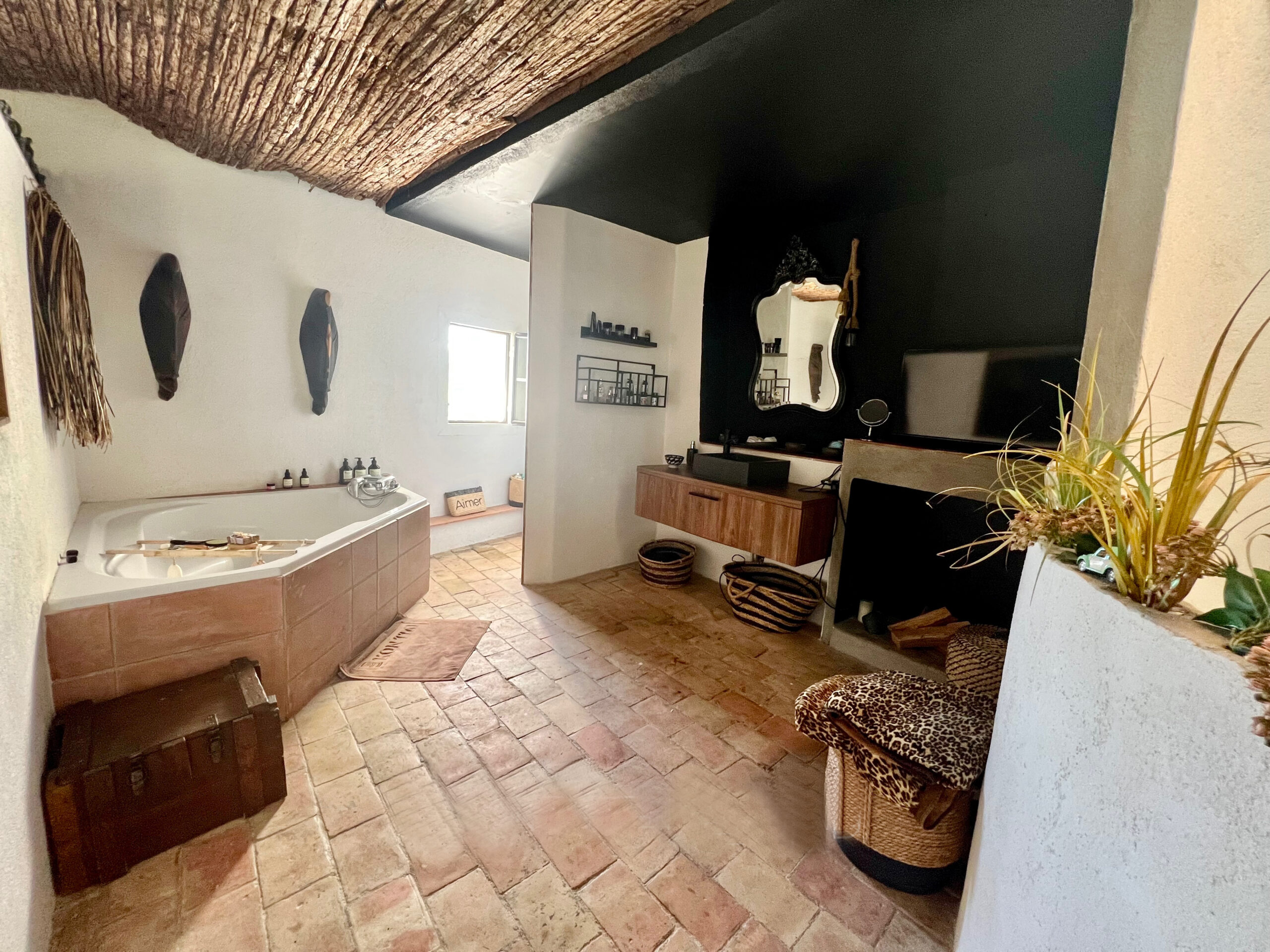 Terre cuite, bois, béton brut, et une audace chromatique — le noir — choisi comme fil conducteur pour souligner l’identité contemporaine du lieu.